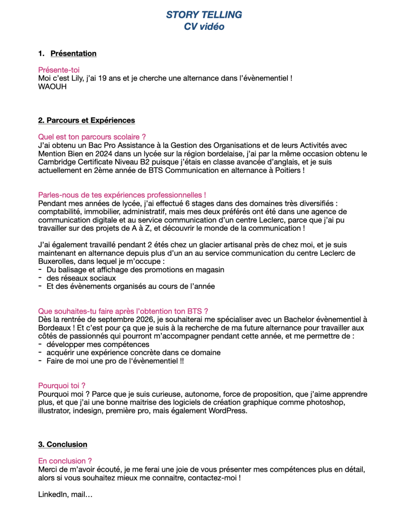 1/ présentation générale de l’annonceur : dans le cadre de ma recherche d’alternance pour intégrer un bachelor en événementiel en 2026, notre formatrice nous a proposé de réaliser un CV vidéo