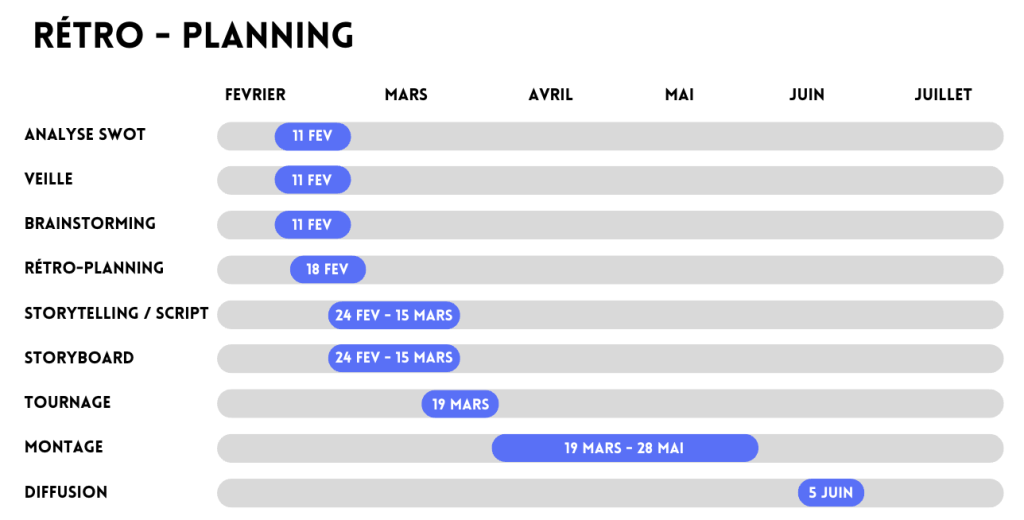 5/ contrainte : délai de 3 mois 1/2 pour rendre cette production (rétroplanning développé plus tard)