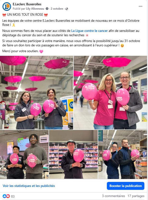 L’idée était de mettre en avant l’implication des équipes du magasin pour Octobre Rose. Visuellement, j’ai choisi un univers rose, avec des photos des collaborateurs tenant les ballons Octobre Rose de la Ligue contre le cancer, car j’ai remarqué que faire apparaitre les collaborateurs sur les posts humanise la communication et renforce la proximité avec notre public, ce qui génère plus d’engagement.